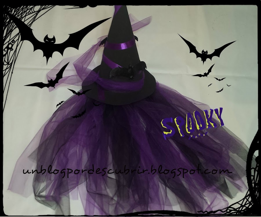 Por eso hoy vamos a hacer un disfraz de bruja, súper fácil de hacer y súper económico. Va a consistir en una falda de tul en negro y morado y un sombrero de goma eva, decorado con murciélagos. Para completar el look podemos usar una camiseta negra o morada, una escoba y disfraz preparado en un momento.