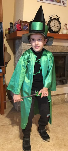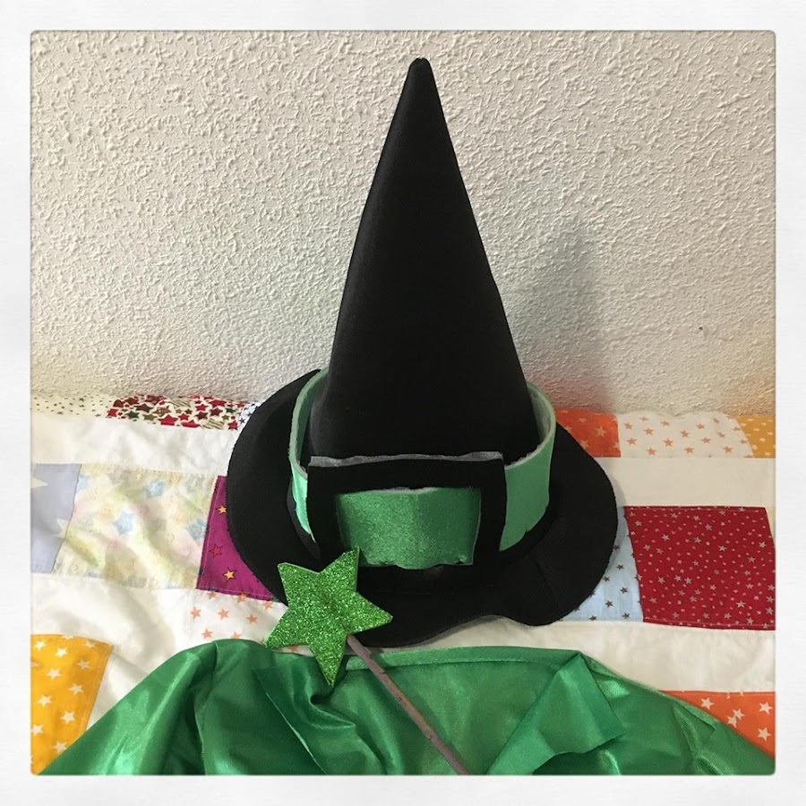 El sombrero lo tenía ya del año pasado. Está hecho con foam. No tenéis mas que hacer un cono y coserle el ala y la cinta. Para la túnica he utilizado rasete de disfraces y el patrón de kimono que más fácil no puede ser, adaptado a la medida del niño.
