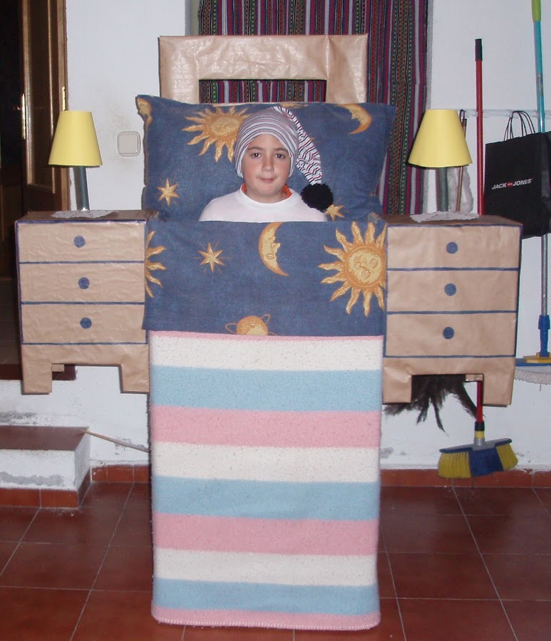 Un disfraz muy gracioso y divertido y además muy económico por que esta hecho de cartón . Lo primero que tenéis que hacer es buscar una caja grande y dos pequeñas para las mesillas. Con una manta vieja y una sabana que tengáis por casa forráis la caja . Las mesillas las forráis con papel y para decorar las pintáis con un rotulador ,las lamparas están hechas de cartulina y con una brida las unís ala caja .