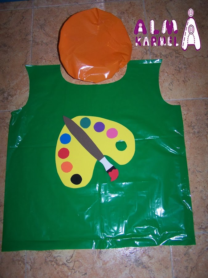 Y como no puede ser menos, un pintor lleva su gorra o sombrero.... y el nuestro es naranja, también hecho con goma eva y una bolsa de basura, eso sí, cada uno se lo adapta a su cabecita....