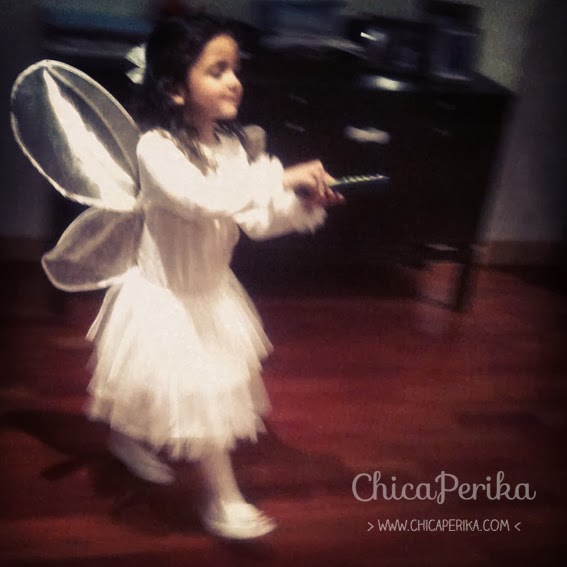 Todo esto completado con unas alas que compré en Ikea, unas medias/pantys blancas, y ¡una niña de lo más feliz!