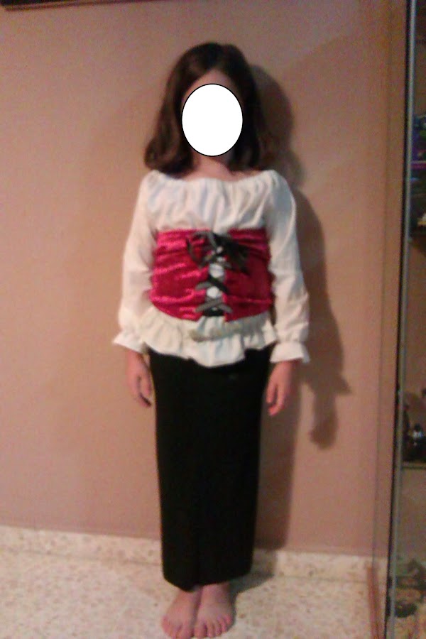 Y.... ¡ALEHOP!.... Un disfraz, jajajajaja, le falta la capa, que ella la quiere, claro, ya veremos de donde la saco pero lo importante ya está. Un poquito de maquillaje y algo de sangre de mentira, quizás añada algún detalle de encaje, o tul negro, no sé, ya veremos.