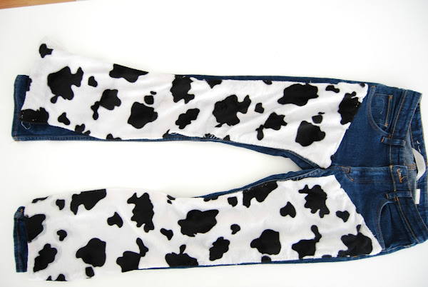 Tela con estampado de vaca (en Carnaval la encontraréis muy fácilmente)Cortamos la tela vaquera a lo largo para hacer dos perneras así (si no os gusta coser, pueden quedar tal cual, sin remate) y las cosemos al pantalón vaquero por la parte de arriba.