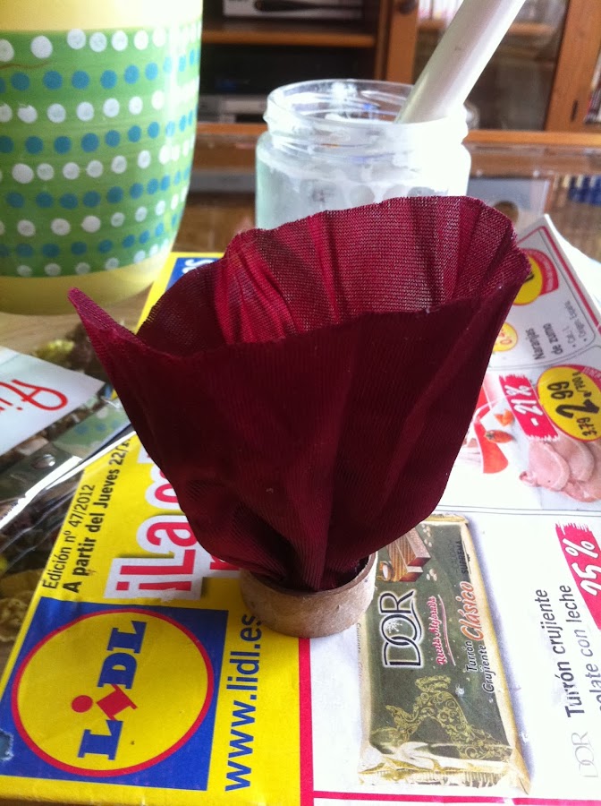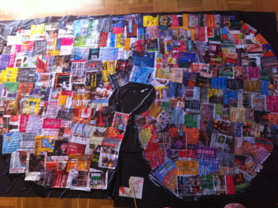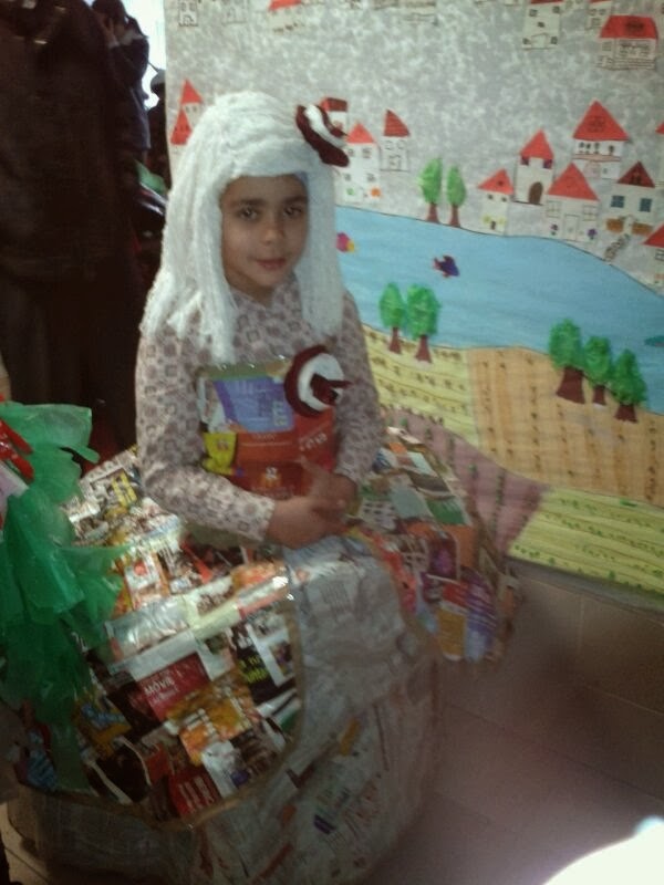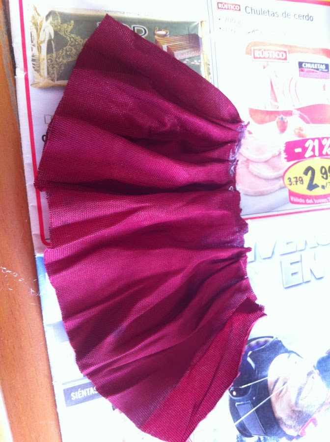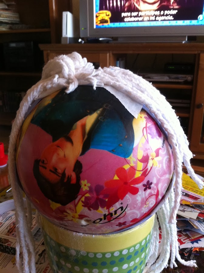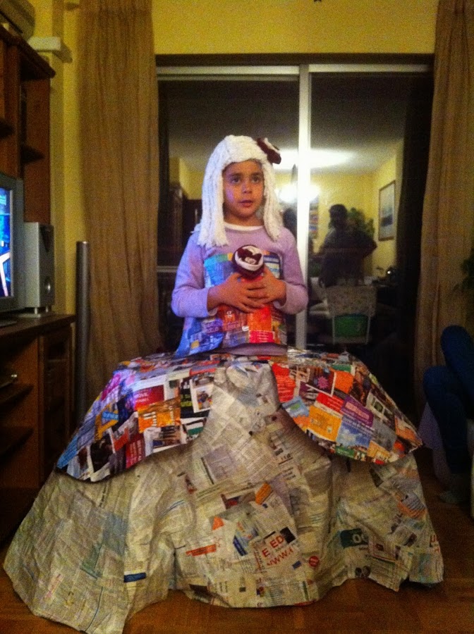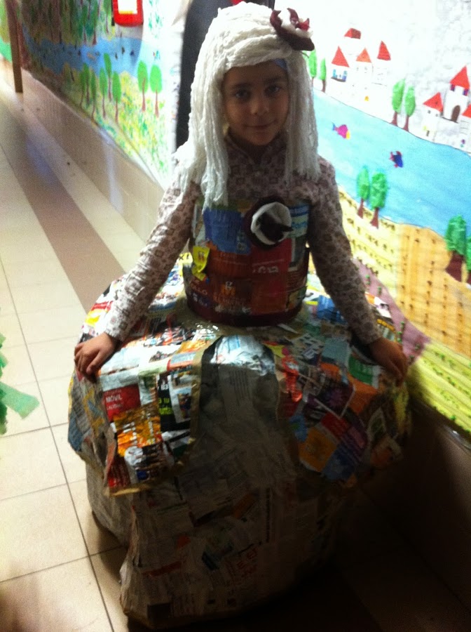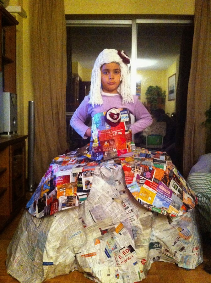 El año pasado el tema del cole de mi hija era hacer un disfraz con material reciclado y se me ocurrió este disfraz de Menina. Para la peluca utilicé una fregona de las de algodón que fui pegando sobre un gorro de natación que ya no utilizaba. Recoretes de revistas para la sobrefalda y el corpiño y, de periódico para la falda. ëstos iban con una capa de cola blanca mezclada con agua sobre bolsas de basuras. Finalmente unos retales de telas para hacer los rosetones del corpiño y de la cabeza.