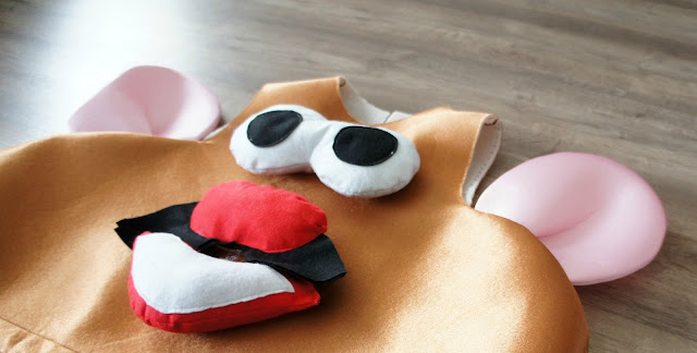 Para las diferentes piezas de la cara de Mr Potato, además de las telas necesitaréis relleno ( yo he usado el de un cojín ) y trozos de fieltro, os recomiendo que tenga unos 5 cm de ancho. Para terminar de fruncir la parte del bajo del disfraz he usado goma de 5 cm.