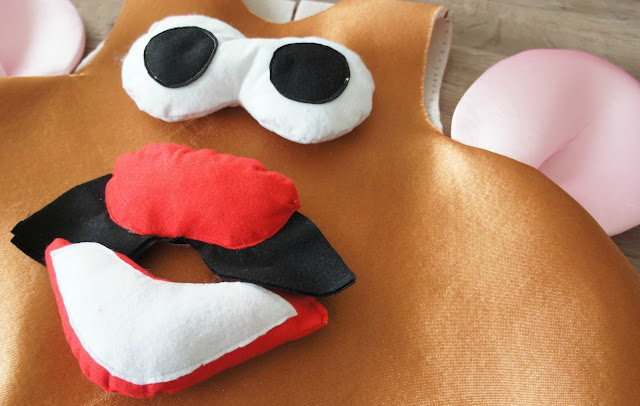 Para las diferentes piezas de la cara de Mr Potato, además de las telas necesitaréis relleno ( yo he usado el de un cojín ) y trozos de fieltro, os recomiendo que tenga unos 5 cm de ancho. Para terminar de fruncir la parte del bajo del disfraz he usado goma de 5 cm.