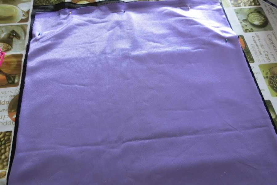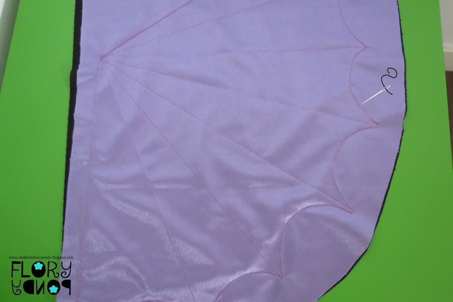 Colocamos las telas con el derecho hacia afuera, osea tocando los revés de ambas telas. ¿Porqué? porque la idea es que la parte de atrás del ala sea negra y el interior del ala sea morada, así quedará mas chulo.