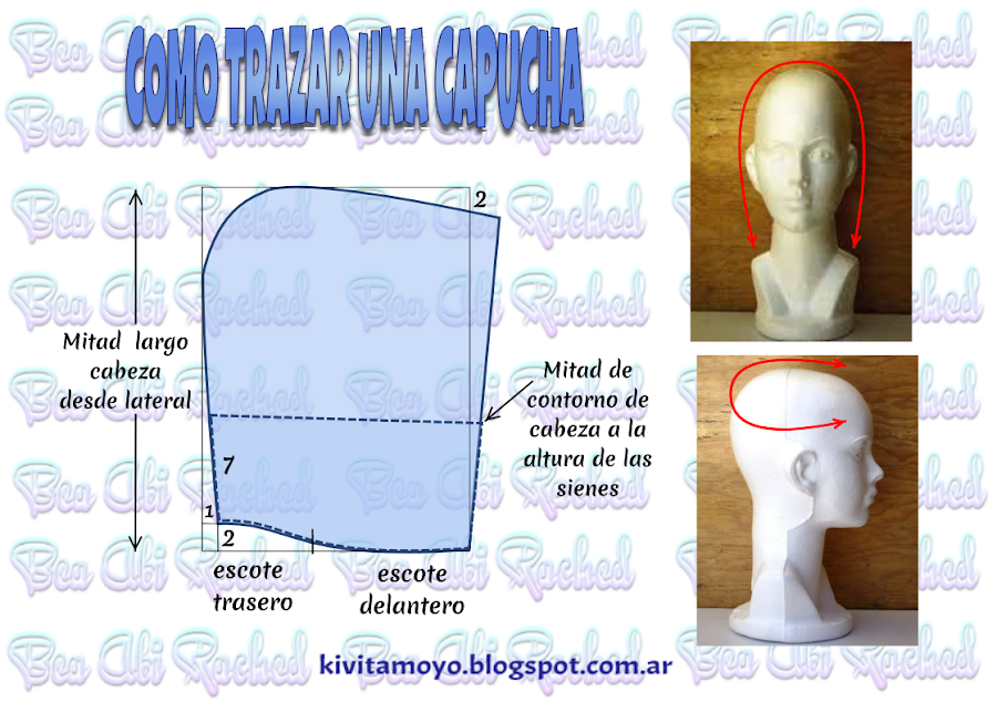 Diseñarla desde el trazo de la capucha basica. Al final del posteo esta el esquema de como proceder a su trazado. Para el alto sera una capucha y media. Dividir en dos, con una linea imaginaria la capucha para la mitad trasera y la mitad delantera. Darle una curvatura en la trasera y una redondez en para el lateral de la cabeza que seran las mejillas, que tambien se repetiran en la mitad delantera.