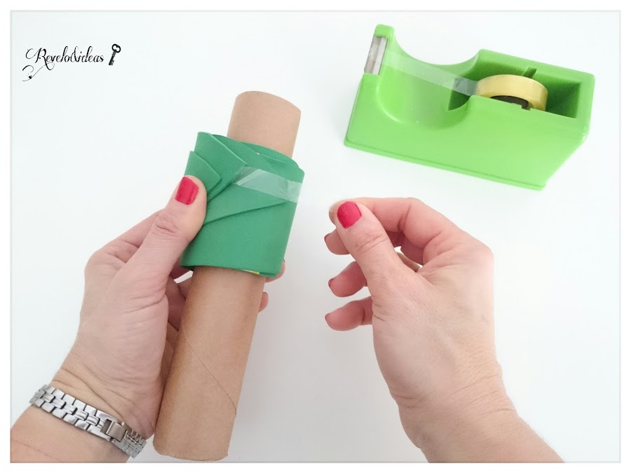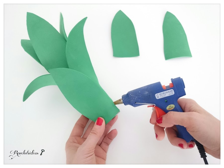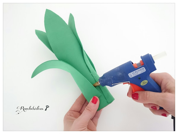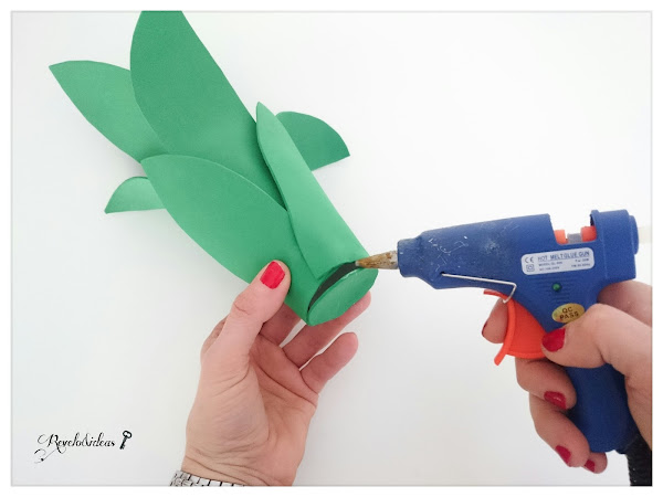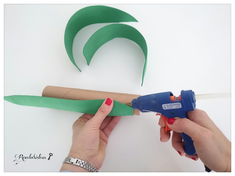 Pegar sobe el rollo de cartón, las 3 hojas grandes de gomaeva, con la pistola de