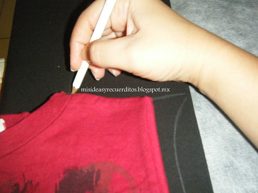 2. Toma la Tiza o el Lápiz de color blanco y traza el contorno de la camisa. Como es un chaleco, dobla la manga de la camisa hacia adentro para marcar.