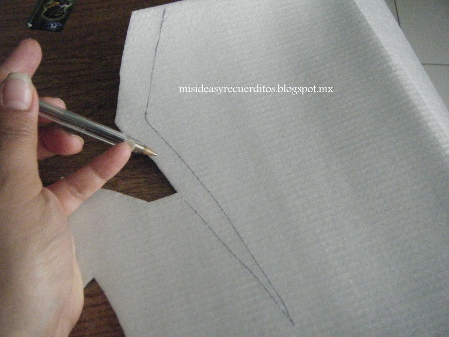 Así que dobla la parte delantera a la mitad y con la Tiza o el Lápiz blanco marca un "triángulo alargado" la punta debe estar hacia el centro del doblez del chaleco.