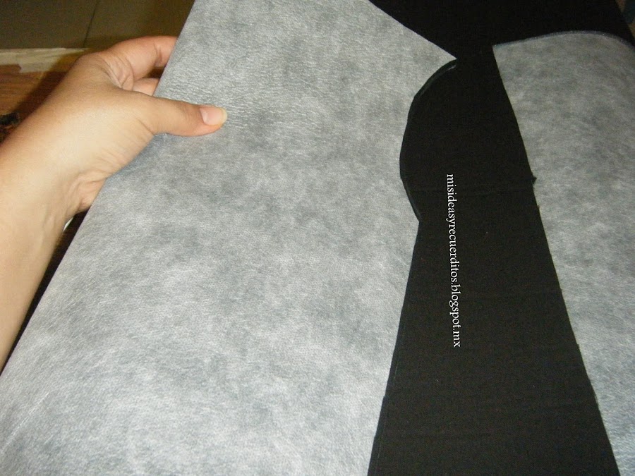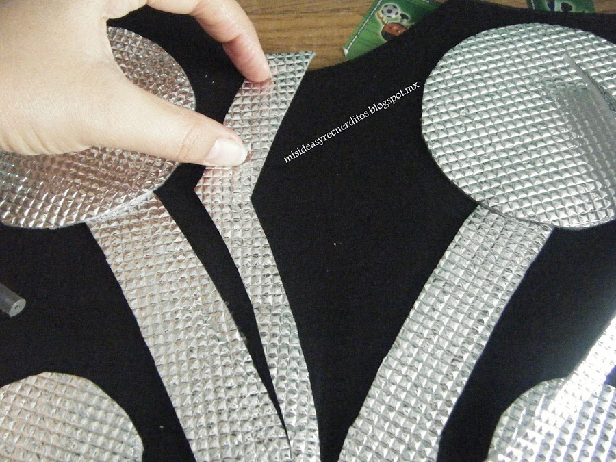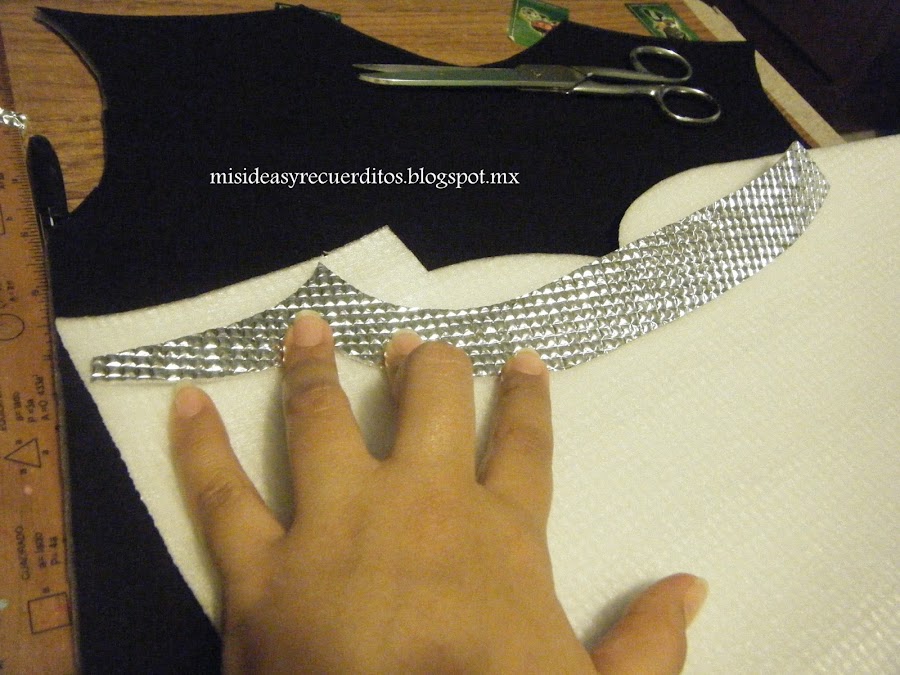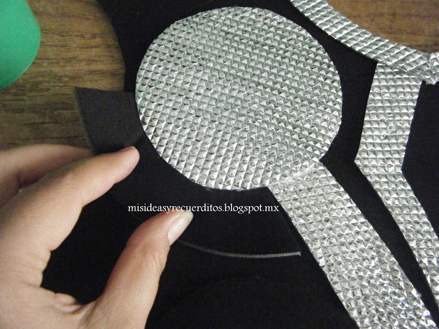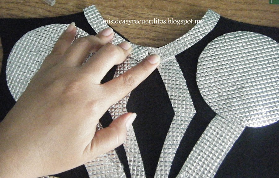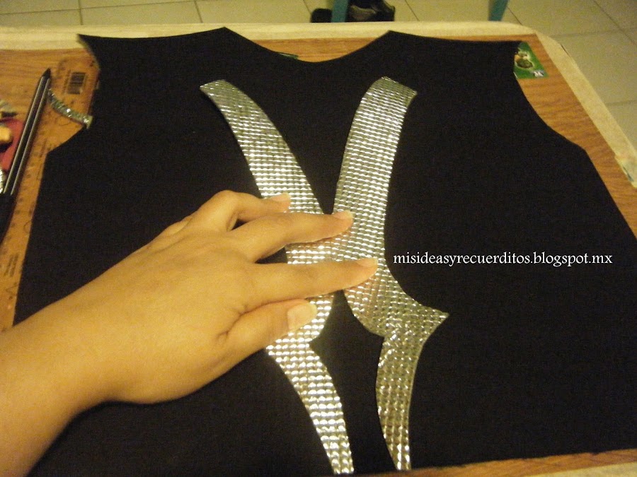 Para adornar el Chaleco de Thor usaremos la tela de pellón color Plata y vamos a cortar las piezas dibujando sobre la parte de atrás.