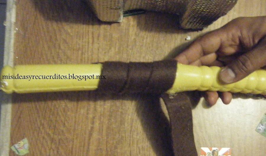 Mi niño tiene un "Chipote Chillón" del Chapulin colorado, le "tomé prestado" el bastón de plástico y se forra con el fieltro, yo tenía fieltro café y de este color lo forré :) se forra dando vueltas sobre el bastón en espiral.