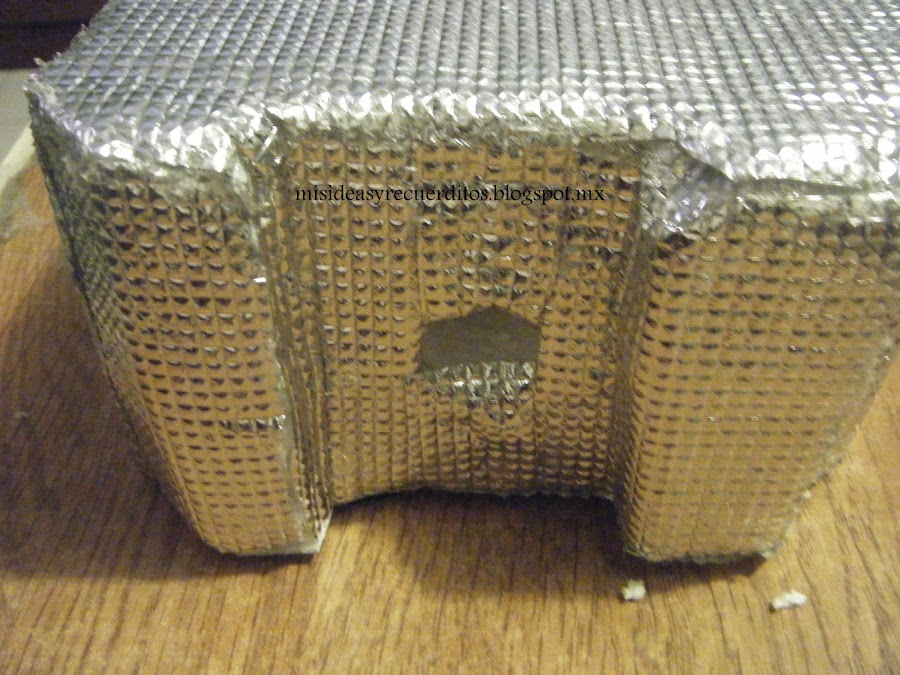 7. Después de hacer el hueco, forra la parte de abajo, no tiene que quedar exacto, corta cuadrados o rectángulos del pellón plástico plateado y ve llenando los espacios.