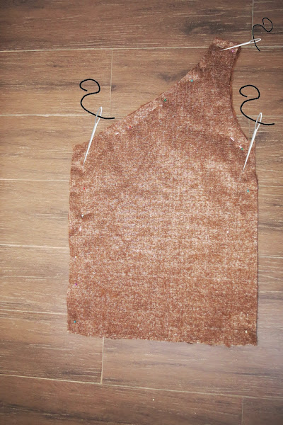 Bien ahora con las dos piezas las juntamos encarando derecho con derecho de la tela y la fijamos con alfileres y coseremos por tres lados, tirante y dos laterales, justo por donde os marco en la foto.