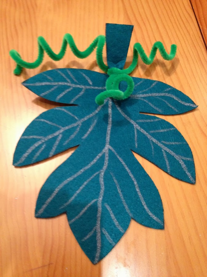 Ponlo sobre el fieltro verde, repasa el contorno y recórtala. Con el rotulador plata dibuja los nervios de la hoja.