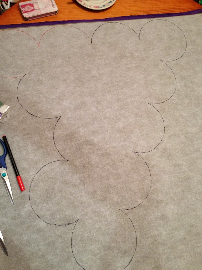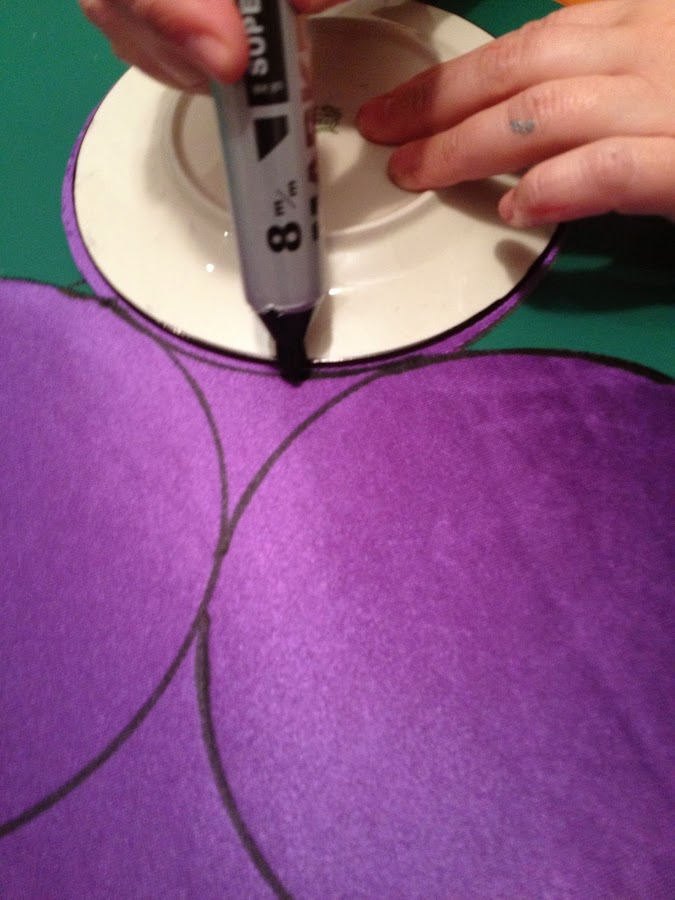 Ahora por el derecho de la tela y ayudándote con el plato, ve dibujando las uvas con rotulador permanente negro, los espacios entre las uvas rellénalos también con rotulador negro.