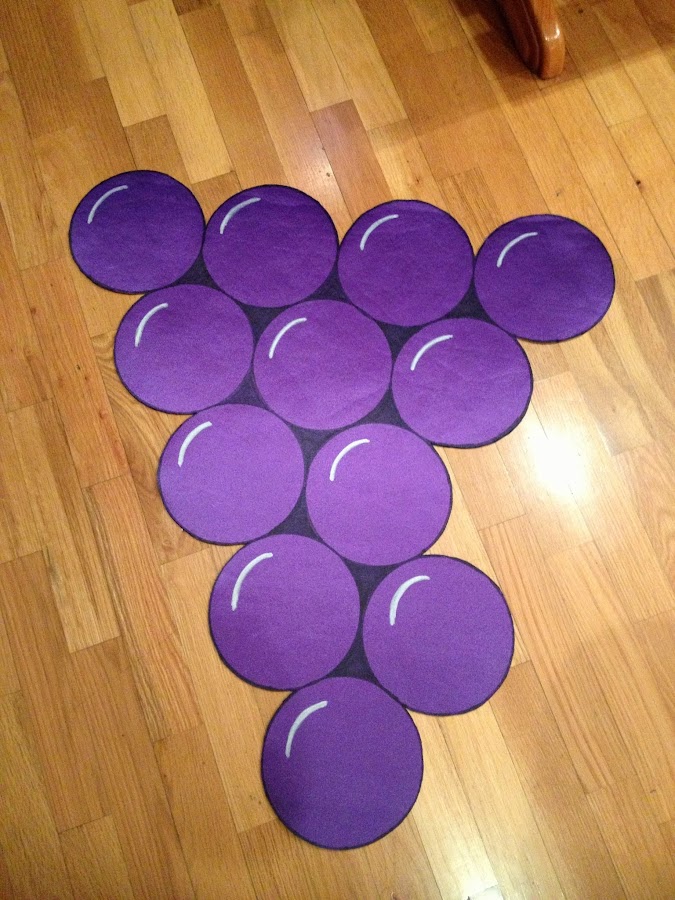 Para montar el disfraz, utiliza la goma elástica para los hombros, como viene en la foto, uniendo la parte de delante y la de atrás. Pega con pistola de silicona. Pega las cintas en el primer par de 2 uvas una a cada lado, para sujetar el disfraz a los lados y que sea más cómodo.