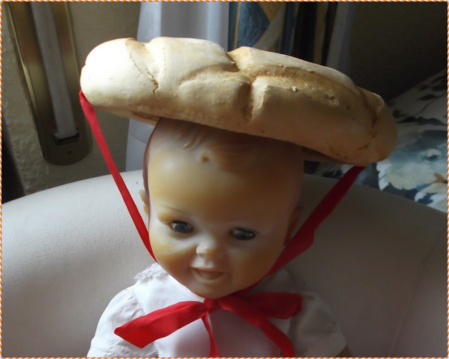 Como no puedo poner fotos de ese momento, os dejo una foto de mi muñeco( muñeco que tengo desde que yo era pequeña) con el gorro de pan puesto, para que os hagáis una idea de como lo sujetaba.