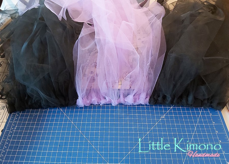 5. Primero las negras, la mitad a un lado y la otra mitad al otro lado. Luego repetimos el mismo proceso con el tul morado y las atamos en el centro.
