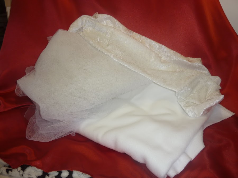 Y aqui estan las telitas, tul, terciopelo elastico y polar para el forro de la capa,