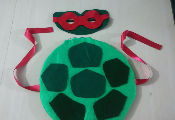 Este disfraz lo he visto en pinterest y me encanto, no puede ser más sencillo y se ve genial, esta hecho con fieltro, aunque el caparazón esta cosido a máquina con pellón por el medio para dar forma le he dejado hueco para que mi hijo le pueda poner juguetes o cosas dentro quizá la espada de juguete, me llevo un par de noches y estoy segura que lo disfrutará muchísimo.