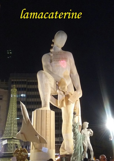 La falla de la plaza del Ayuntamiento me pareció original y desconcertante al mismo tiempo ya que no termine de ver su significado. Eso si, la ejecución perfecta y mucho trabajo ya que esta construida con finas tiras de madera. Por la noche vimos que en el interior tenia un corazón palpitante y un mensaje en el pecho en apoyo a la candidatura de las fallas para ser nombradas patrimonio de la . humanidad por la UNESCO...muy original.