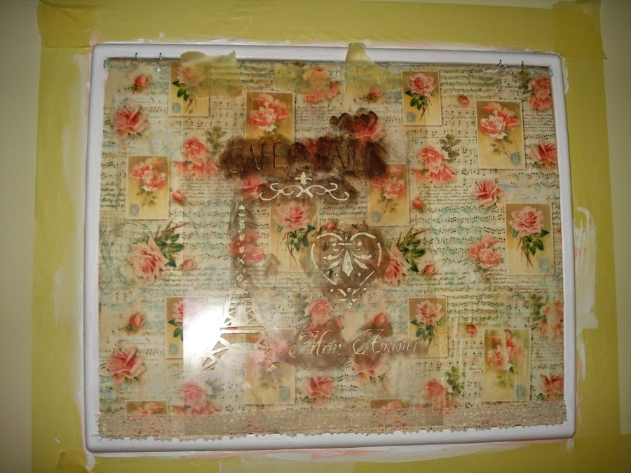 Para los estarcido utilicé el marrón chocolate para que destacara un poco sobre la plantilla, con la esponja di unos toques para "envejecer" un poco pero me pasé y no me gusta el resultado pero...
