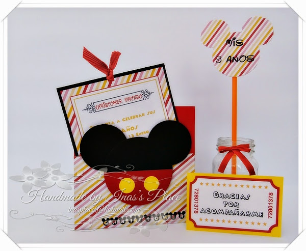 Hoy continuamos con los maravillosos personajes de Disney. Esta invitación la trabajé con los colores de mickey mouse pero utilizando un papel decorado de rayas para darle un toque diferente.