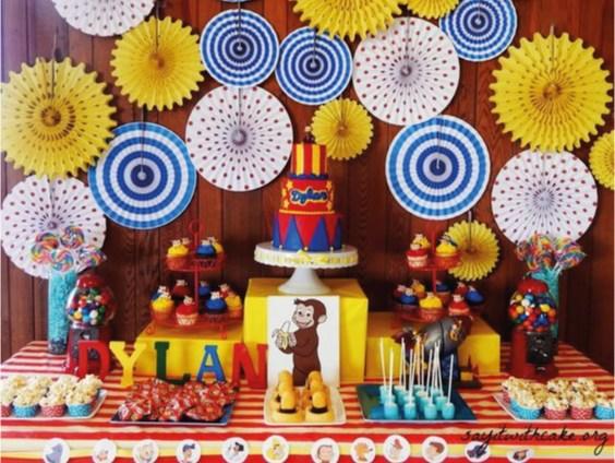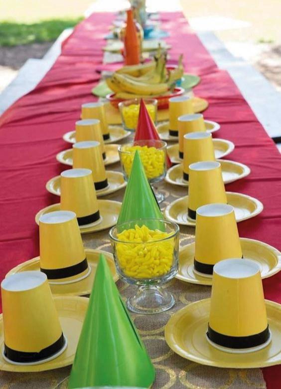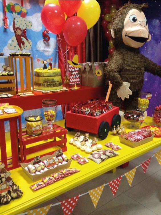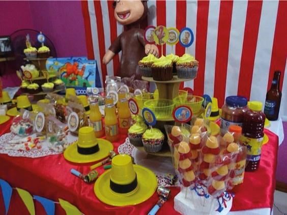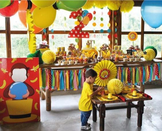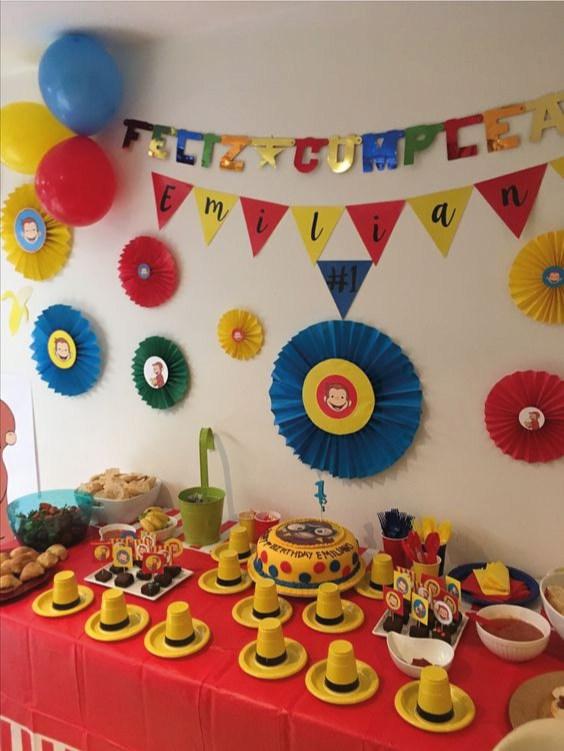 En la decoración de Jorge el curioso predominan los colores rojo, amarillo y marrón. Pero como la temática es muy divertida puedes agregar otros colores como el turquesa o verde. No olvides decorar la fiesta con muchos globos, a los chicos les encanta y quedan perfectos en esta temática.