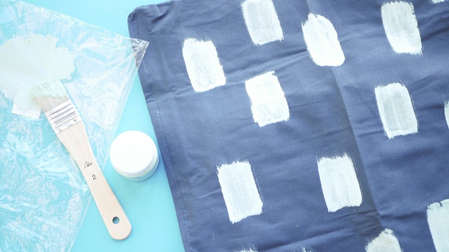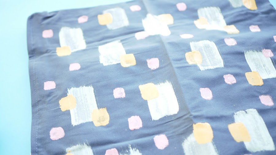 Como quería hacer un estampado abstracto, asigné cada color a un tamaño de brocha diferente y fui haciendo brochazos por todo el cojín creando un estampado colorido. Debes tener en cuenta que para que no traspase la pintura de un lado al otro del cojín, hay que meter papel o cartón en el interior.