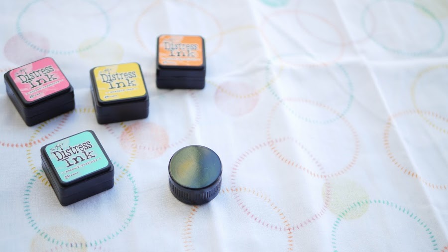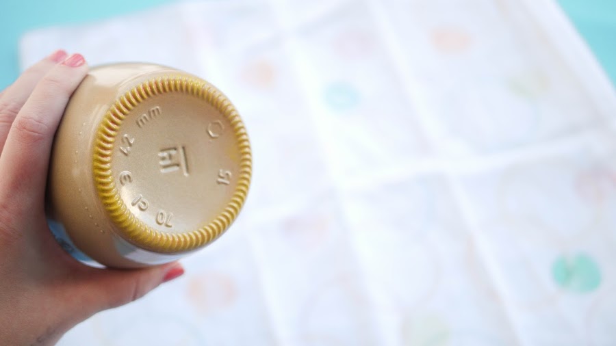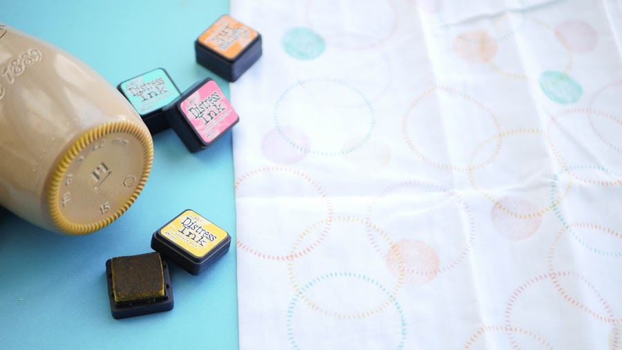 También aproveché el tapón de la botella y, de la misma forma, apliqué un poco de tinta y presioné sobre el cojín. Para que la tinta quede bien repartida en la tela, como el tapón es una superficie metálica, te aconsejo que lo gires un poco sobre sí mismo.