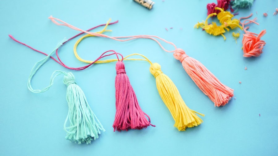 Y para completar este cojín tan colorido, me animé a hacer unas borlas y coserlas en las esquinas. Escogí hilos de los colores más similares a las tintas que encontré. Por cierto, si no sabes hacerlas, puedes ver el paso a paso en mi vídeo cómo hacer tassels (que es como se llaman a las borlas en inglés).
