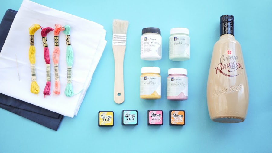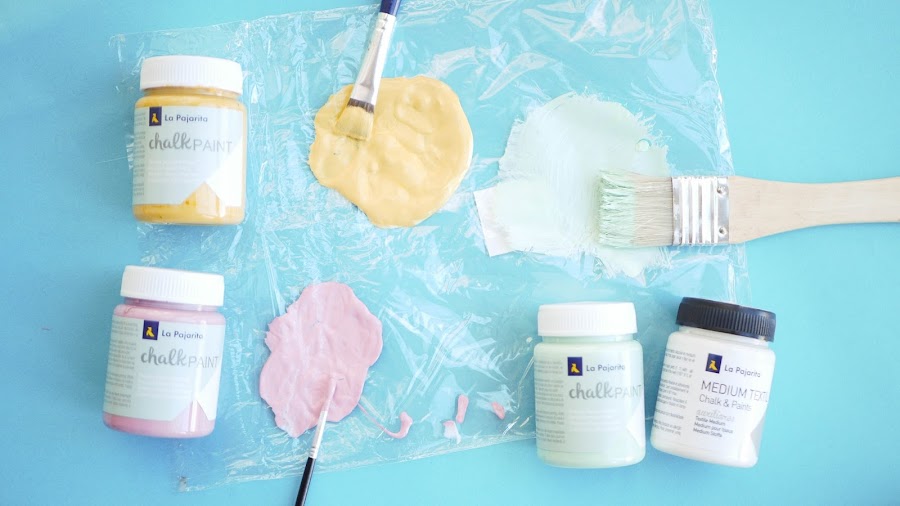 Lo primero de todo es preparar las pinturas. Llevaba tiempo queriendo probar el medium textil de La Pajarita. No sé si lo conocéis pero es un producto que transforma las pinturas de chalk en pinturas textiles. Una pasada, verdad? Solamente hay que mezclar la pintura y el medium a partes iguales y listo!