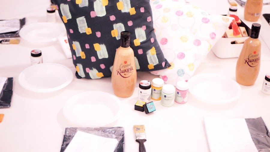 El taller consistía en hacer unos cojines. Así que para sacarle el máximo partido a las botellas de Ruavieja se me ocurrió que podíamos hacer un estampado con el culo y el tapón. Y para completar el tiempo del taller, por qué no un cojín pintado? A todo el mundo le gustan. Y así surgió la idea de estos dos cojines para el taller.