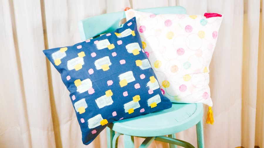 Lo que necesitas para hacerlos es: cojines (yo escogí uno oscuro y uno claro de 40x40cm que podéis conseguir en Opitec), pinturas, brocha (yo utilicé 3 de distintos grosores para hacer mi estampado) y tintas para sellos. Si además quieres añadir las borlas en las esquinas, te hará falta hilo grueso o lana, aguja de bordar y tijeras.