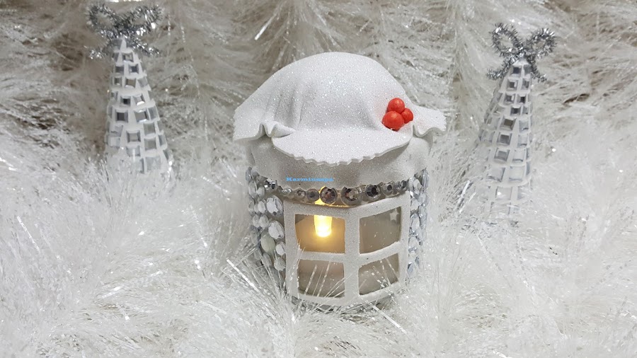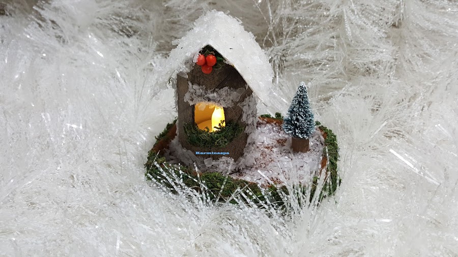 La primera casita es un clásico de Navidad con su chimenea y su tejado de dos aguas nevado, sus ventanas engalanadas con musgo, su puerta decorada con acebo y ¡por su puesto...! no puede faltar un lindo arbolito de Navidad. Ya mismo paso a dejarte los materiales que he usado: