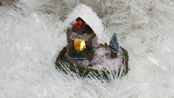 La tercera y última casita es otro clásico de lo más simpático. No le falta de nada, su tejado a dos aguas nevado, su linda ventana con musgo, un hermoso pino navideño y todo ello sobre una bella base nevada. ¡Y como no...! ahora te dejo los materiales utilizados: