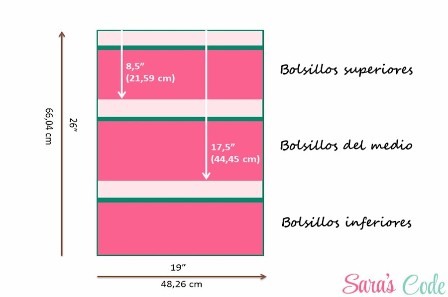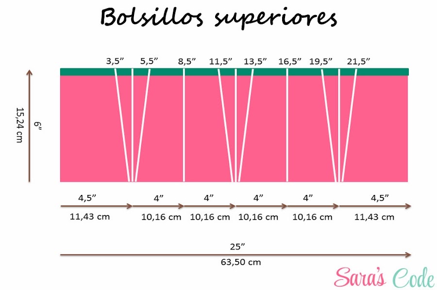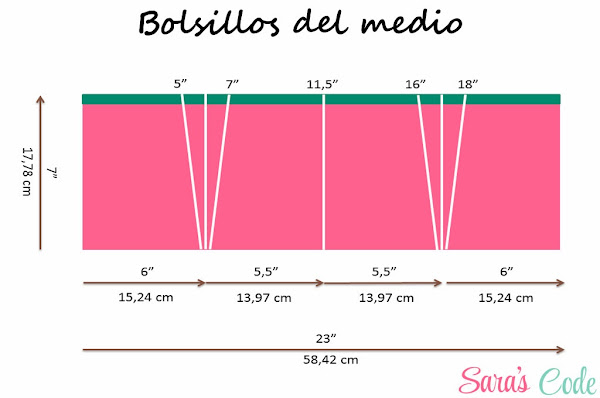 Como el tamaño de los bolsillos no llegaba a convencerme, cambié las medidas de todo el proyecto: (margen de costura 1/2 pulgada - 1,27 cm, incluido)
