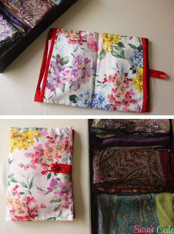 Esta bolsa en forma de libro permite tener los foulards bien doblados y guardados, sin arrugas. Se me ocurrió hacerla a pocas horas de salir de viaje por lo que no tuve tiempo de preparar un tutorial en condiciones. Aún así, voy a intentar explicaros el paso a paso lo mejor posible.