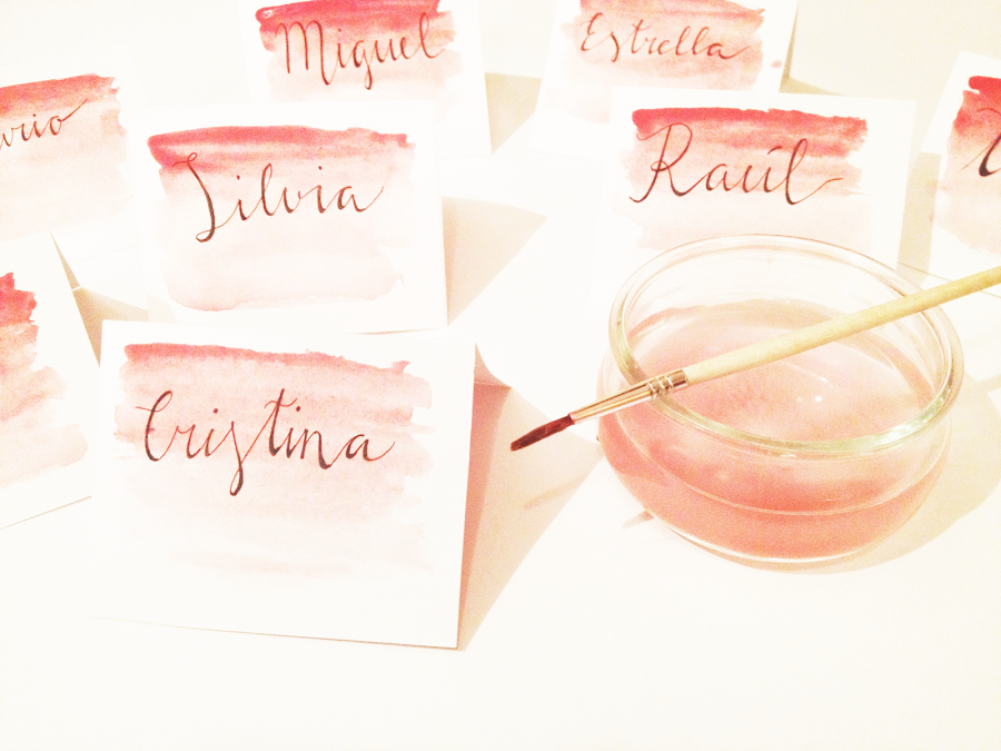 - pintamos con la acuarela sobre el nombre. Yo he puesto pintura arriba del todo y luego he ido diluyendo con agua hacia abajo, para que quede ese efecto degradado que tanto me gusta.
