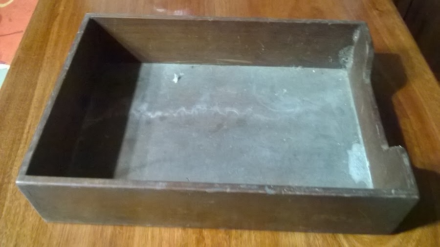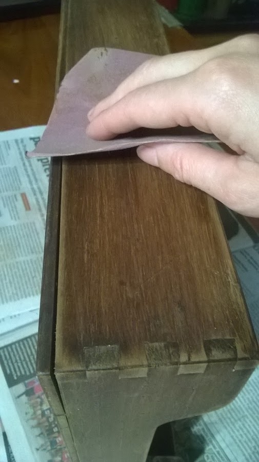 Limpié y lijé, y pensé en dejarle la madera natural por fuera porque me gusta el detalle del malletado que tiene, así que solamente pinté por dentro...