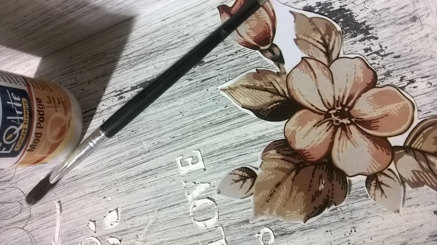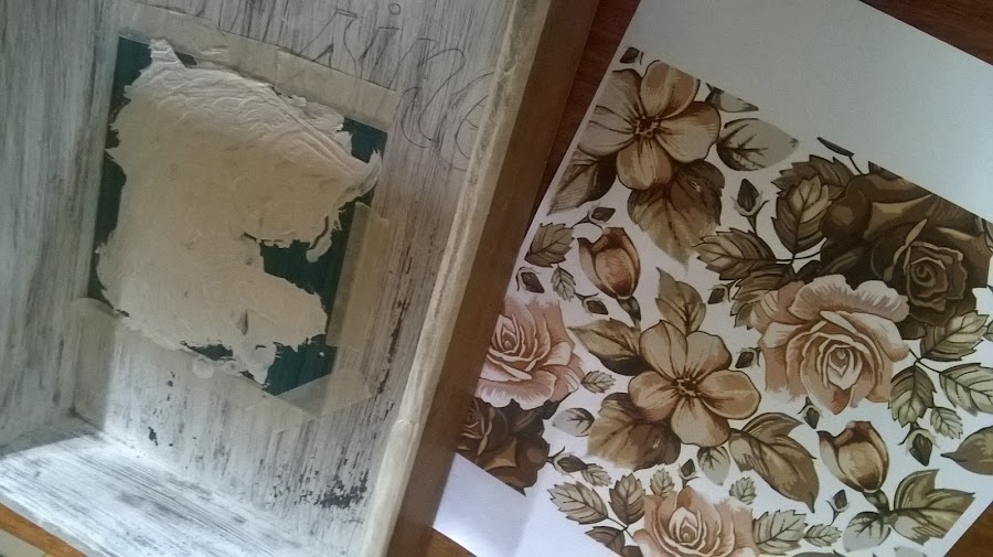 Aquí coloqué el mod podge y sobre este la imagen, se deja secar bien y con muuuucha paciencia y un poco de agua se va quitando el papel hasta que quede la imagen transferida.