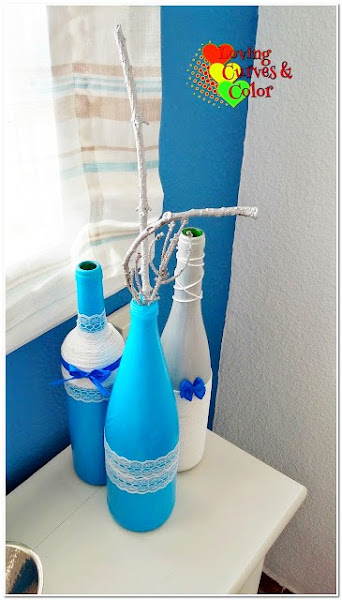 Y este ultimo set de botellas que me encanta y que decoré hace un tiempo fue muy fácil de hacer y el coste, entre las puntillas, las cintas, los hilos y demás fue muy bajo, puedes ver el paso a paso aqui.