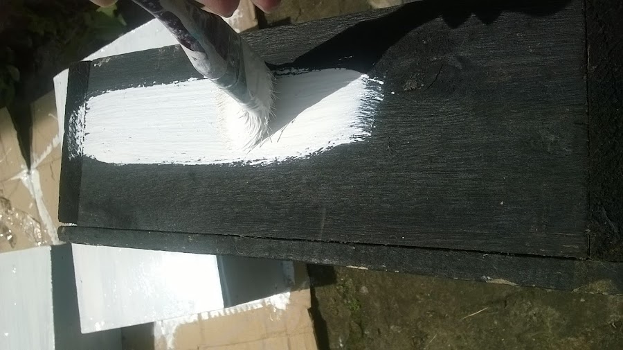 Los pinté con pintura sintética mate blanca, luego con cinta de enmascarar delimité las zonas que quería pintar con celeste y por dentro gris.