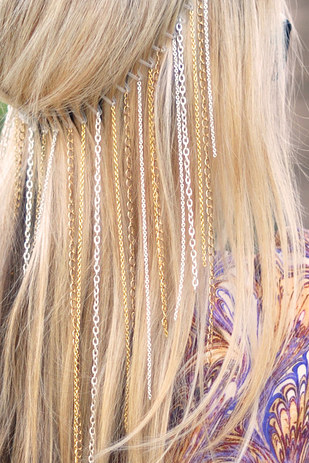 Si tienes una vincha de dientes y cadenas que ya no usas, arma un look super hippie haciendo una vincha con cadenas.