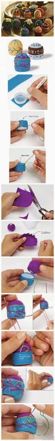 Y por último, estos dos tutoriales explicados paso a paso que se hacen en un momentito. Para el primero necesitas fieltro y un tapón. Y para el segundo un tarrito de cristal, donde se coloca el acerico en la tapa y el bote nos sirve bien para botones, agujas...