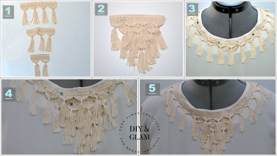 Cortar otra tira de flecos del tamaño del cuello de la blusa. Fijarlo con alfileres.