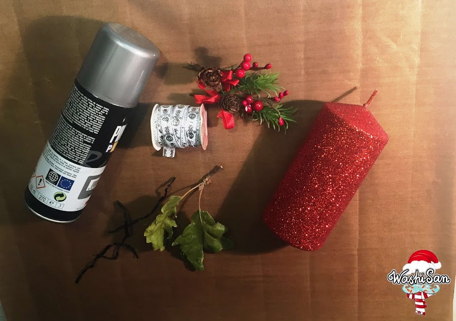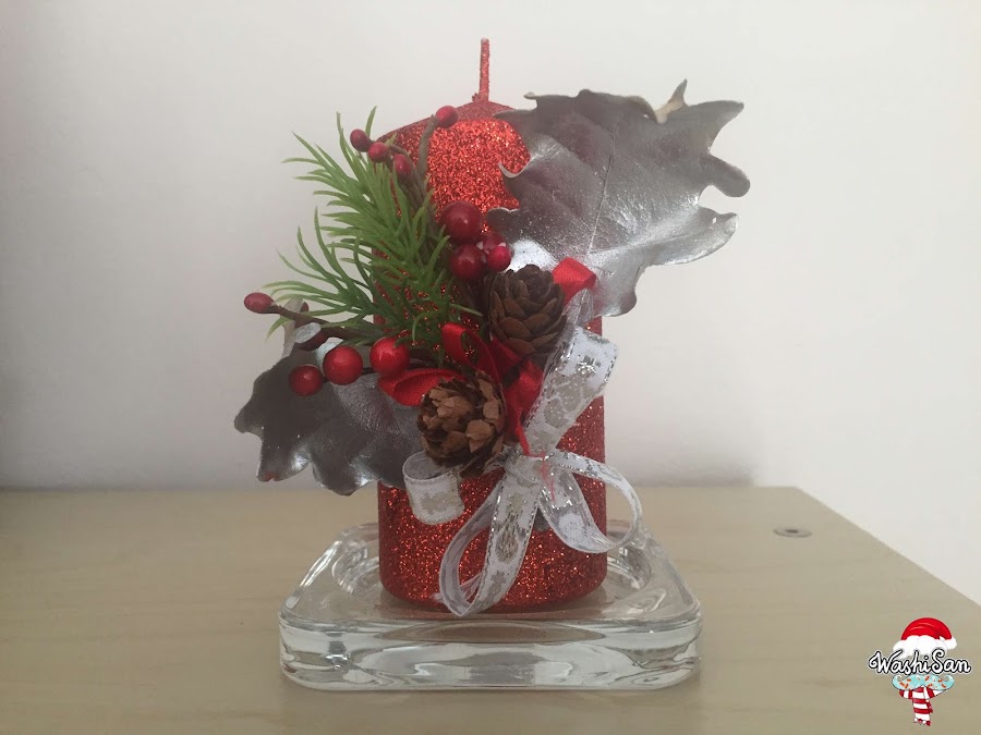 El segundo adorno consiste en la decoración de una vela roja. La decoramos con hojas secas plateadas, un lazo plateado y reciclando unos adornos verdes que venían en años anteriores en los regalos de unos conocidos grandes almacenes. MATERIALES