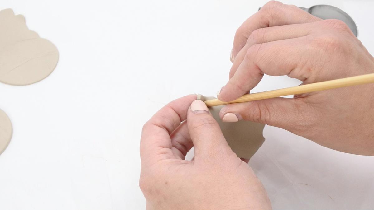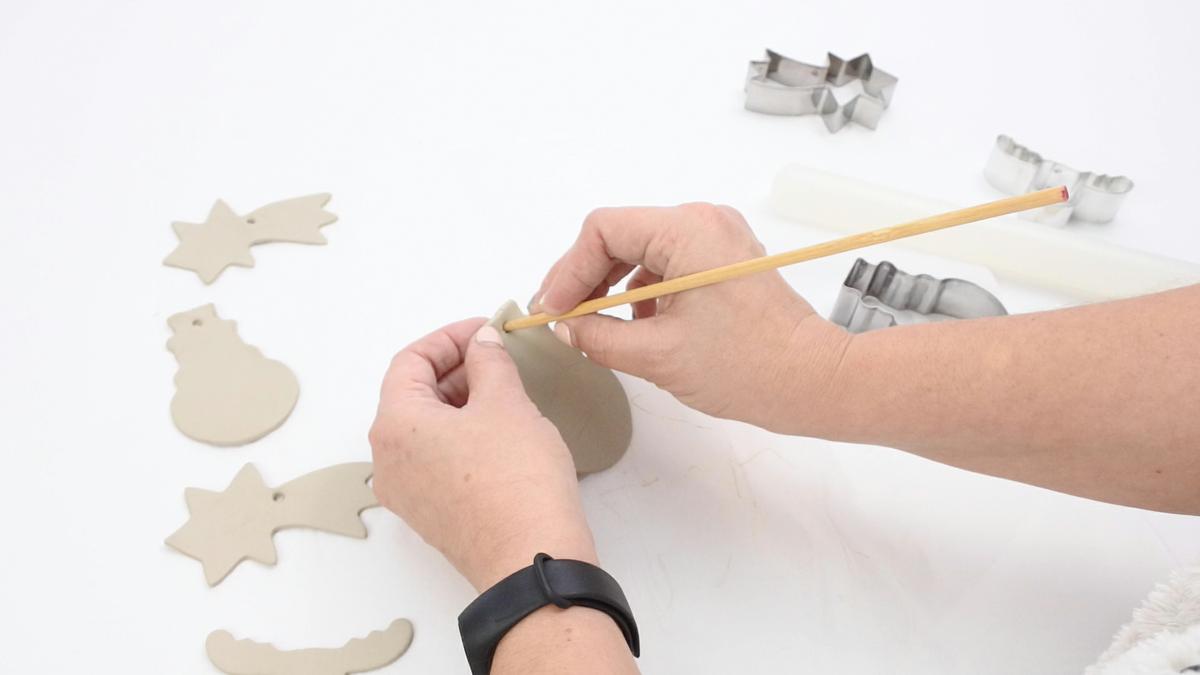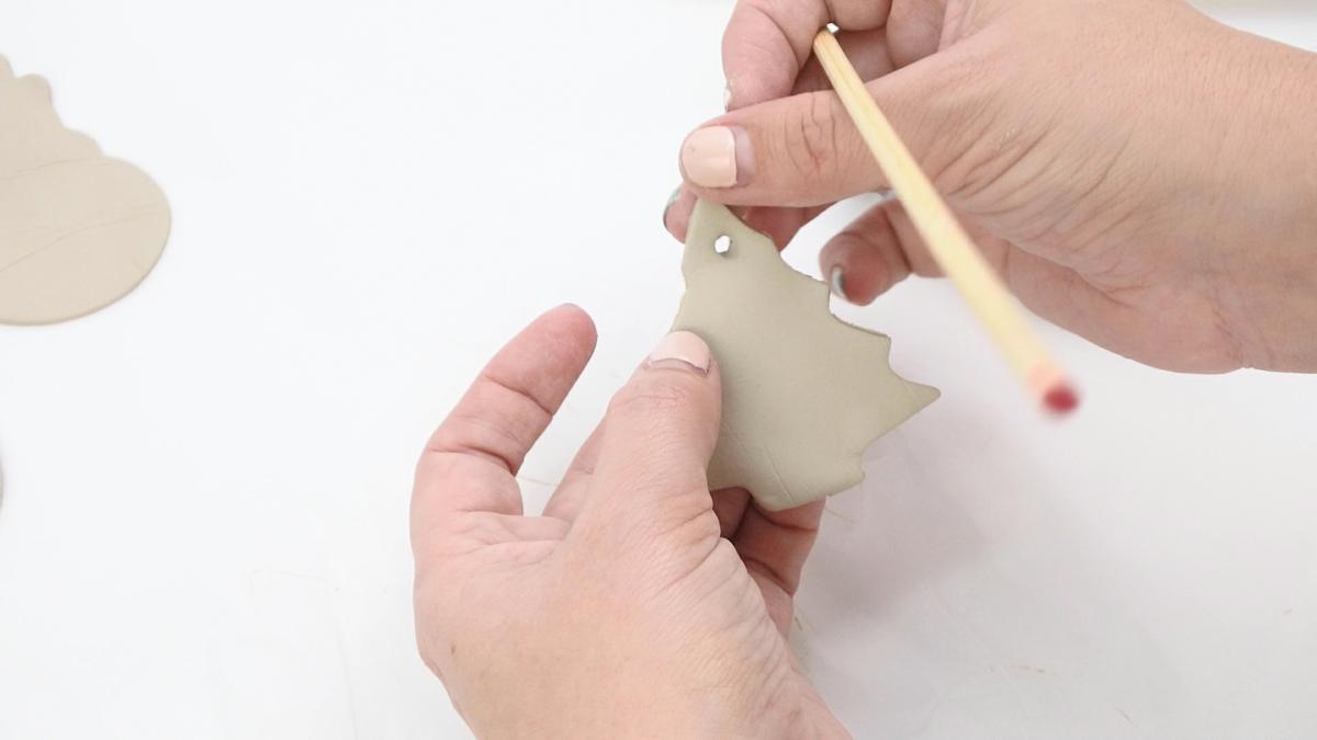 Antes de que sequen, con un palito les hacemos el agujero por el que después pasaremos el cordón para poder colgarlos. Es importante que repasemos que el agujero queda bien marcado.